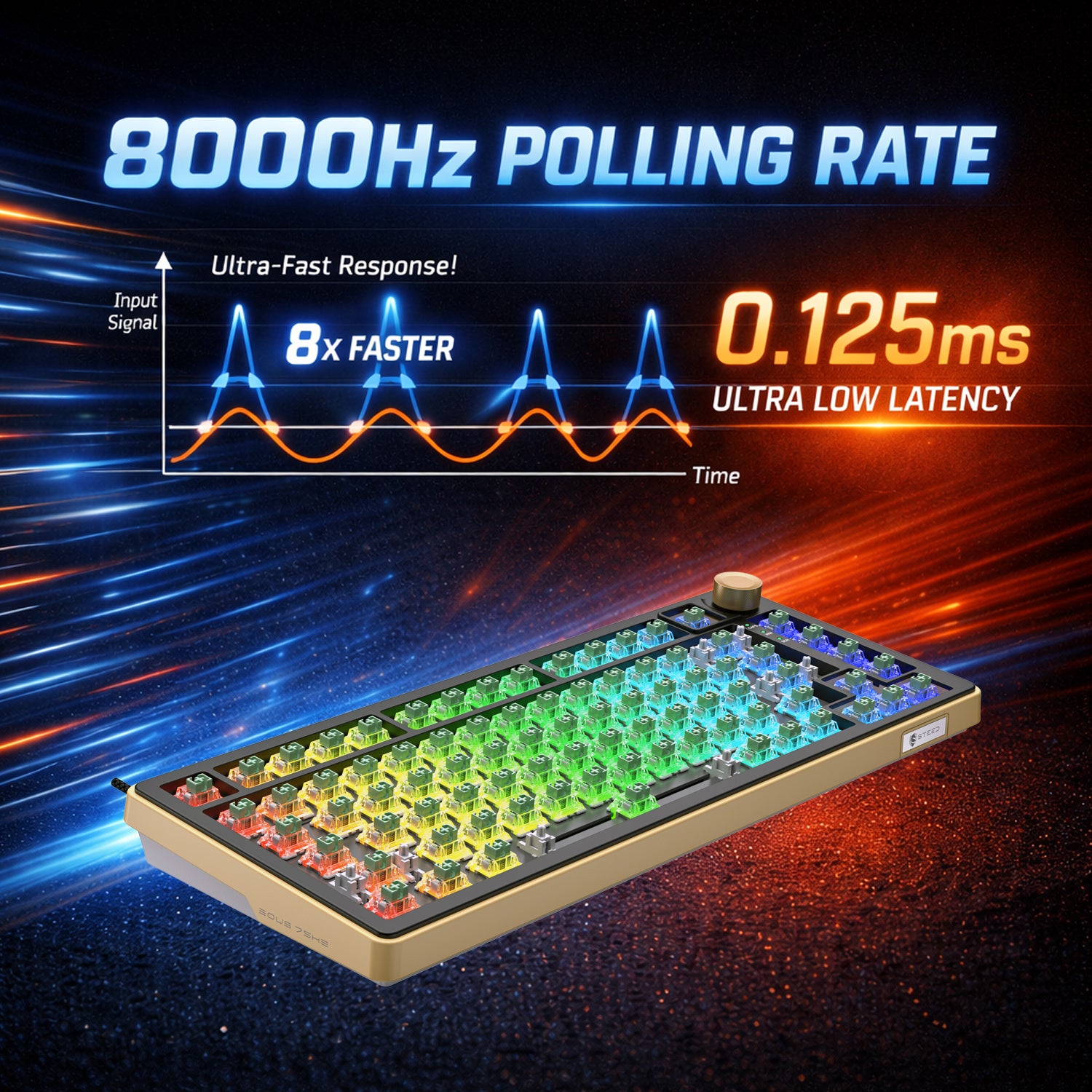 With True 8kHz polling and 64kHz key-position scanning, the Eous 75HE strips latency down to ultra low levels at only 0.125ms, delivering inputs faster than human reaction time—built for players who demand absolute precision.