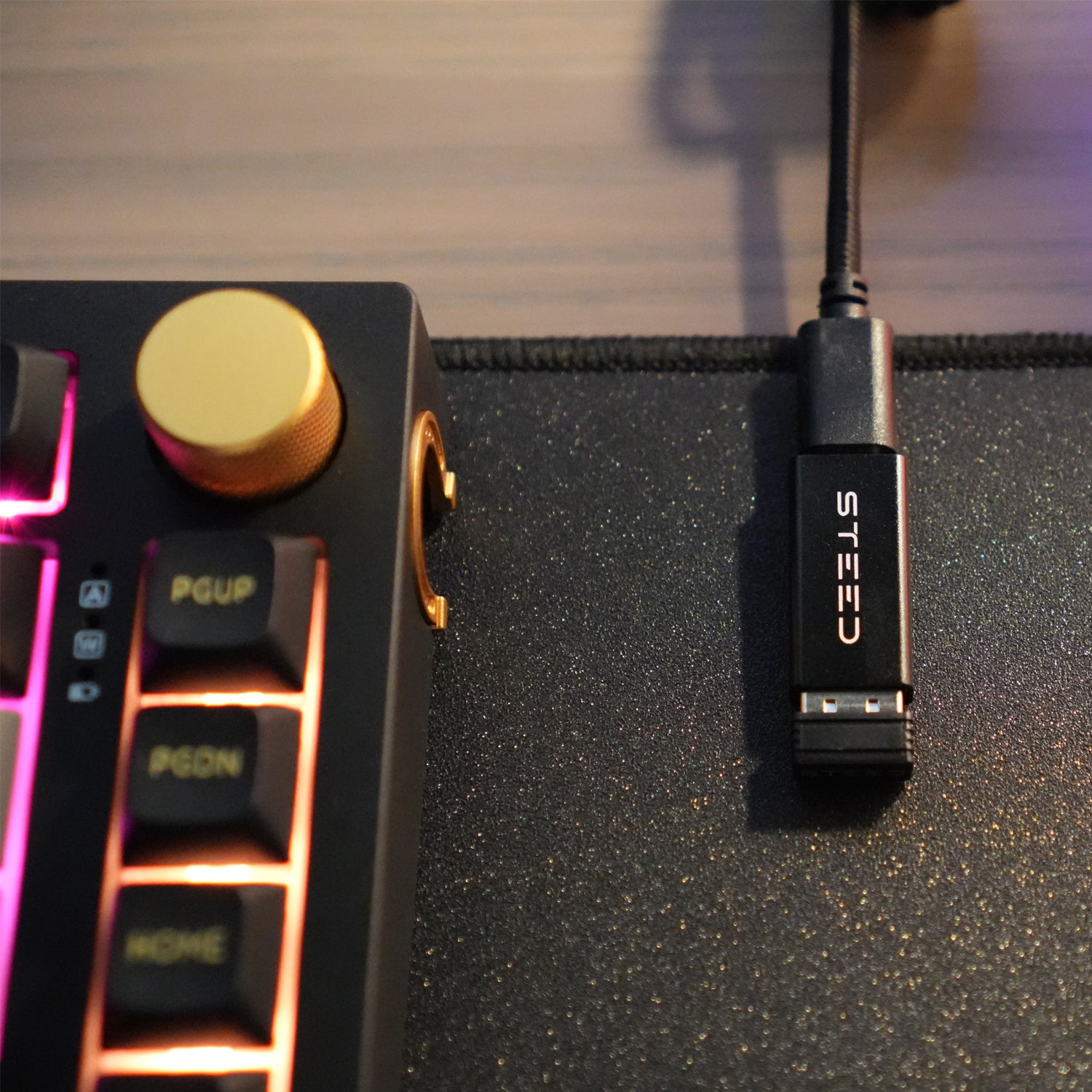 With a simple adaptor, we were able to greatly improve the seamless wireless connectivity between the keyboard and the dongle. Paired with the in-the-box braided cable, the dongle can now be right next to the keyboard, eliminating any intereference to the 2.4GHz signal if it were at the back of the PC. Effortlessly eliminating latency.